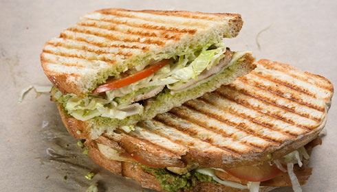 Chicken breast on toasted Panini, pesto, lettuce and tomato